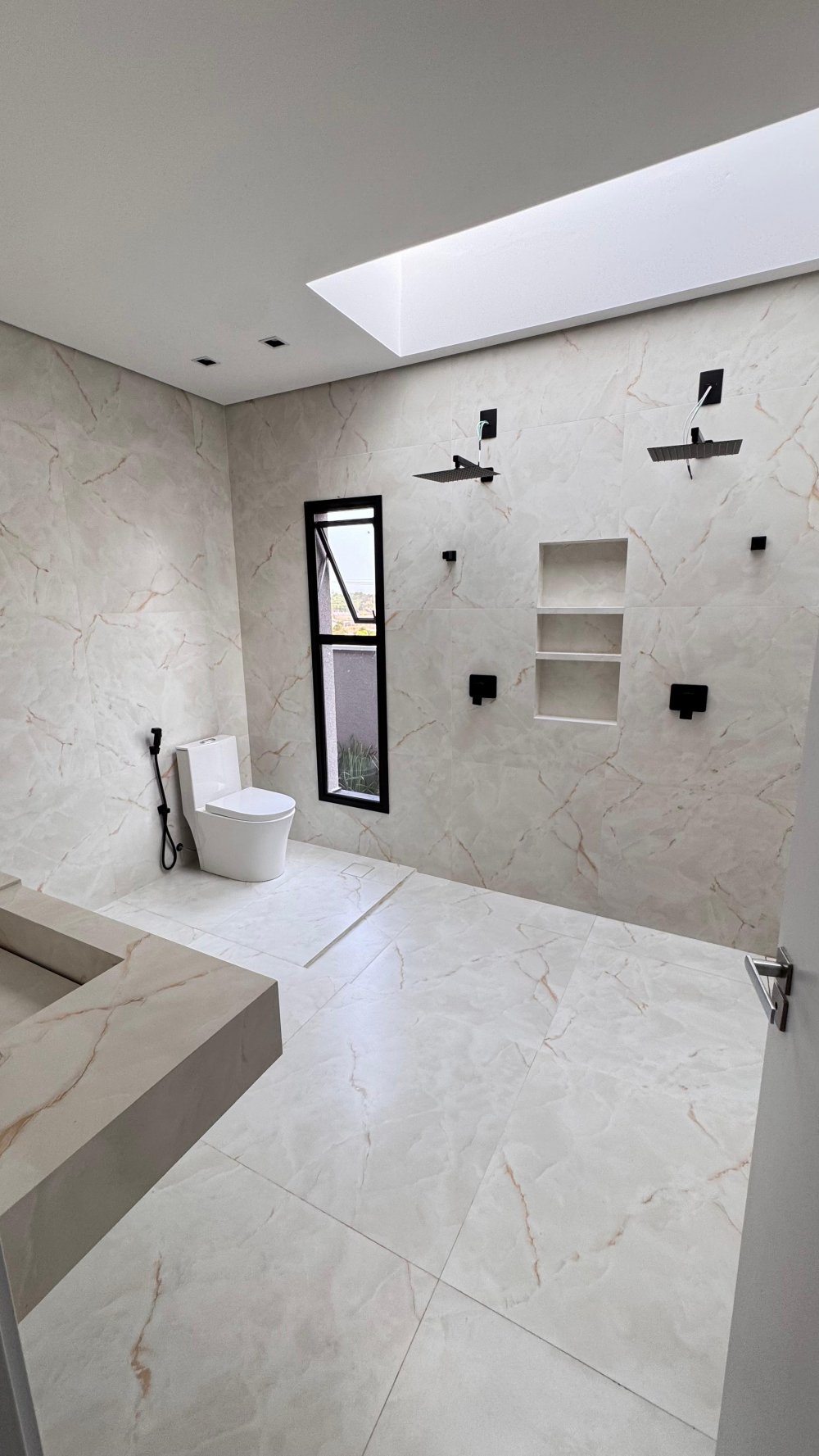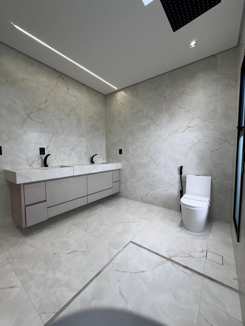 Banheiros com acabamento premium e cuba esculpida em ônix iluminado