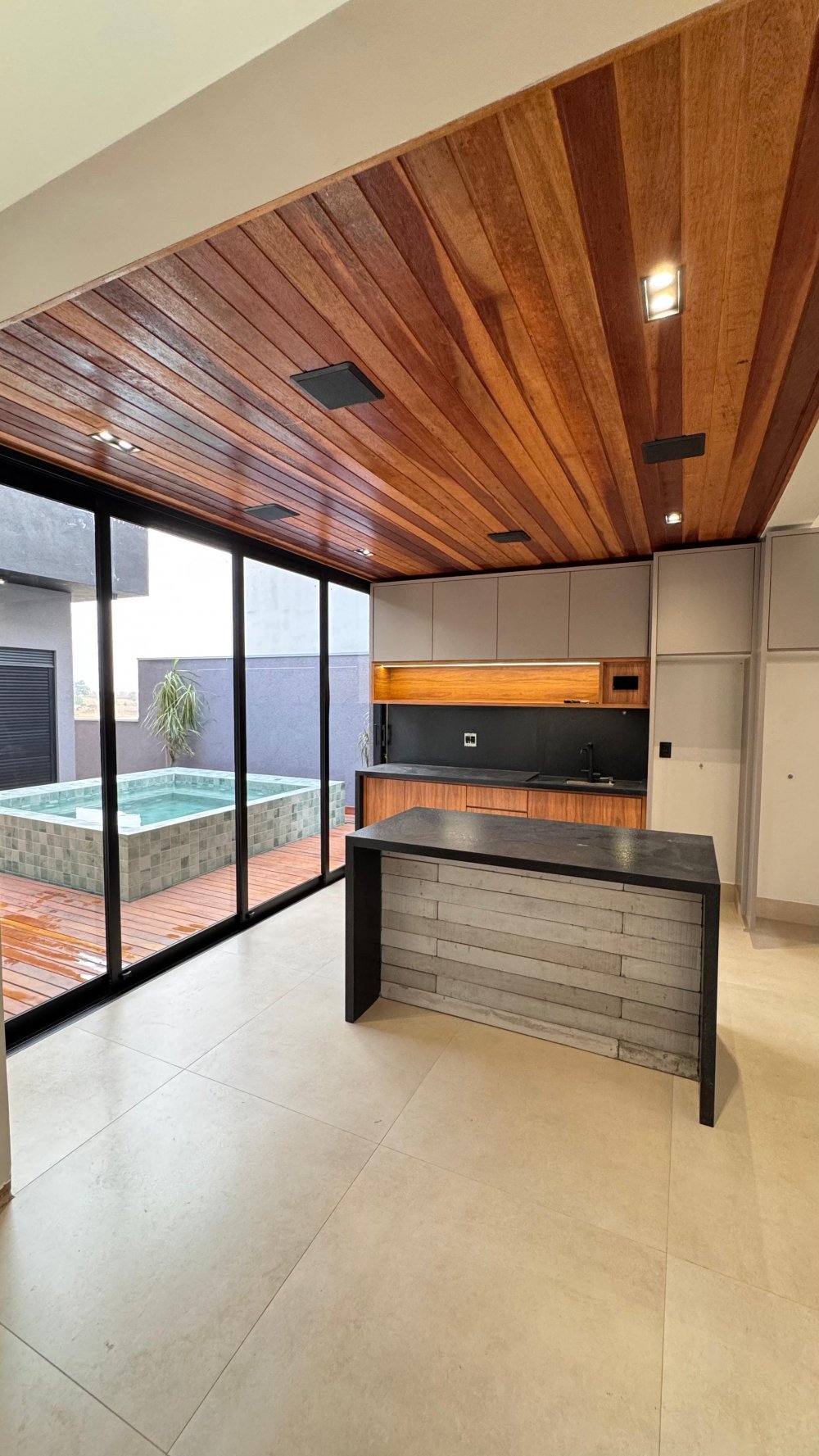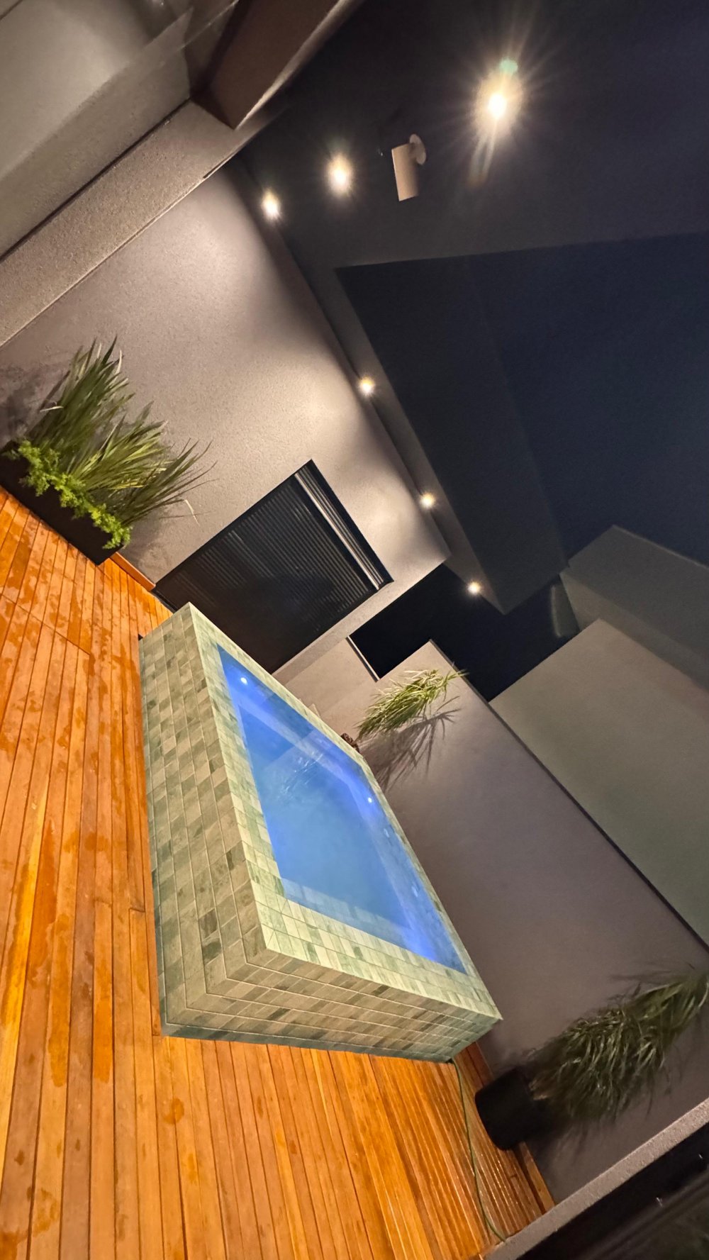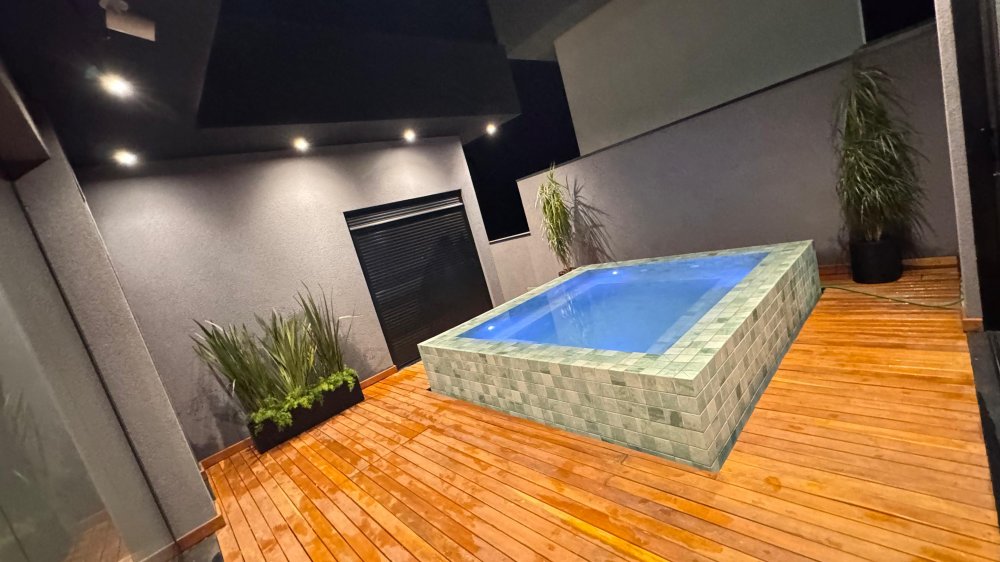 Área externa com jacuzzi, deck de madeira e paisagismo