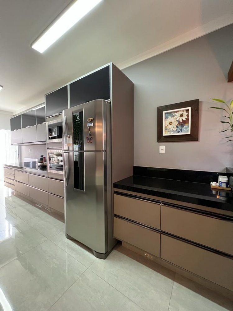 Cozinha moderna com armários planejados, bancadas em granito.