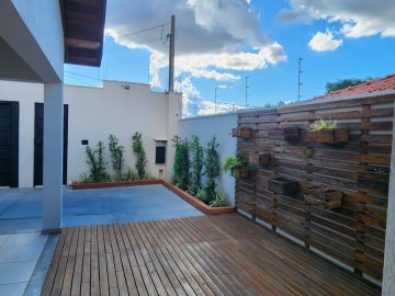 Área gourmet com churrasqueira, paisagismo e deck de madeira